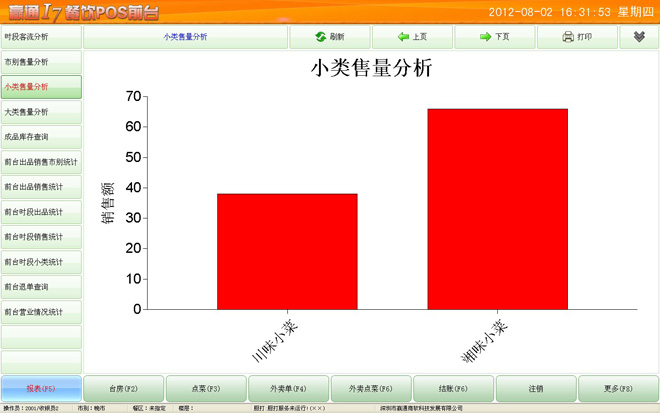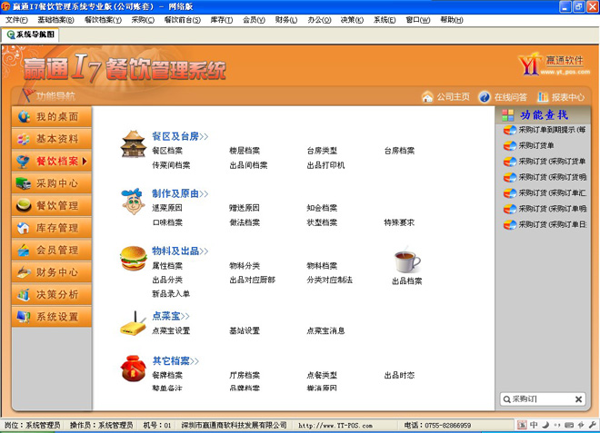 4. 支持导航图、流程图自定义,支持模块搜索,完全自定义的管理软件。 ![]() 5. 支持多业态管理,中餐、西餐、快餐管理一体化,企业更灵活扩张业务,适合长期发展。 6. 菜品、物料可以同时管理重量和数量,双管齐下。以乌龟为例,既可管理乌龟数量,又可以管理乌龟重量,确保数量、重量管理。 7. 前台采用全新点菜界面,苹果ios风格,触摸使用更顺手,特有的前台报表,不用开后台就可知晓当天业绩。 ![]() 8. 支持多种点菜宝和市场主流的厨打设备,特有厨打监控,可以监控到打印前状态,确保不掉单。 ![]() 9. 即将推出赢通I7餐饮win8平板无线点菜,集合电子菜谱、触摸屏点菜、点菜宝于一体,除了其功能强大外,简洁低调的界面风格,完美烘托出客户的高端性。 赢通I7餐饮管理系统主界面: