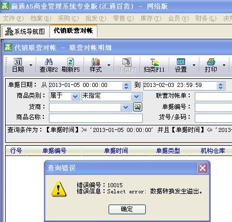 零售管理-代销联营对账-联营对账明细,一查询就出现“错误编号:10015,错误信息:Select error:数据转换发生溢出,这个是什么原因