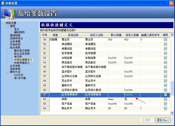 1. 先在后台→系统设置→参数设置→前台参数→收银快捷键定义中设置前台会员消费查询快捷键,比如ctrl+s,如图1: